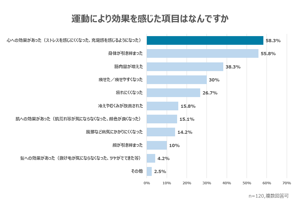 『筋肉を増やすための運動により、どのような効果を感じたか』という問いに対する答えは、1位 「心への効果があった(58.3%)」、2位 「身体が引き締まった(55.8%)」、3位 「筋肉量が増えた(38.3%)」という意外な結果に。